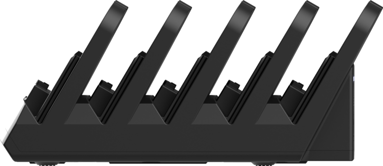 Une seule batterie alimente à la fois la tablette et le terminal de paiement, tandis qu'un chargeur à 5 emplacements permet de garder des batteries de rechange prêtes à être remplacées instantanément, sans temps d'arrêt ni interruption.